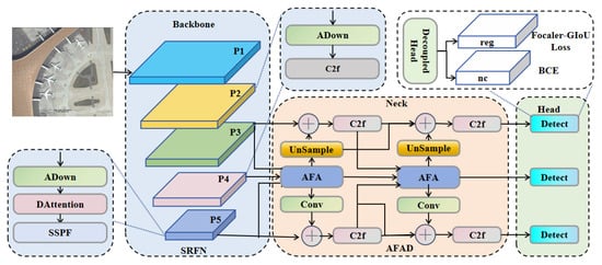 Overall architecture of SRFAD-Net. Backbone uses SRFN to construct a five-layer feature pyramid for multi-scale feature extraction, Neck further implements feature extraction, aggregation, and diffusion through the AFAD module, Head performs localization and classification, and Focaler-GIoU Loss provides higher accuracy for describing target position.