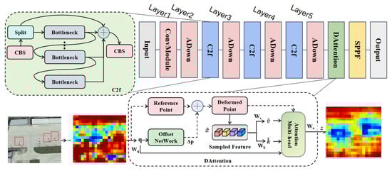 Architecture of the proposed SRFN. Layer 1 extracts low-level feature information through convolutional modules, Layers 2–4 consist of ADown modules and C2f modules, and Layer 5 introduces DAttention modules.