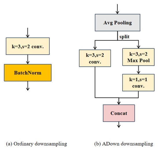 During the processing of remote sensing image detection tasks, feature pyramids are constructed through downsampling. Typically, this involves using convolution with a stride of 2 to reduce the image size, as illustrated in Figure 3a. Remote sensing images, characterized by diverse imaging methods, often exhibit substantial variations in complex backgrounds and target orientations. This variability poses a challenge, as downsampling can easily result in the loss of information about small targets, leading to false positives and missed detections, thereby compromising the overall detection performance. Hence, the implementation of an effective downsampling strategy is crucial for extracting key features while minimizing computational costs. This article adopts the ADown module, as shown in Figure 3b. This approach combines the benefits of average and max pooling, effectively preserving both rich background information and salient features during downsampling. It also enhances the network’s robustness in detecting perception targets of varying scales and shapes.