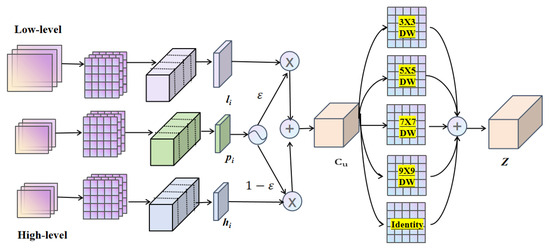 After merging p in the channel dimension, is processed through a set of parallel depthwise convolutions to extract contextual features. These convolutions utilize kernels of 3, 5, 7, and 9 without dilation, thereby preventing overly sparse feature extraction. Subsequently, 1 × 1 convolution is employed to fuse the local and contextual features. This 1 × 1 convolution acts as a channel fusion mechanism, integrating features with varying receptive field sizes. Finally, the output is obtained.