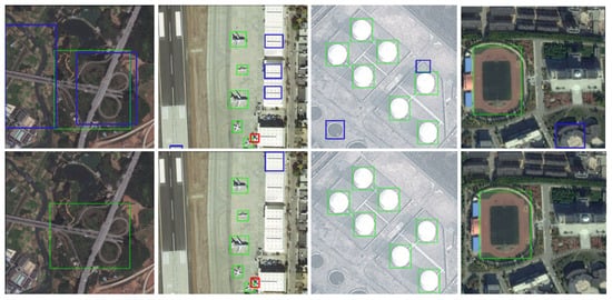 Figure 7 provides a comparative analysis of detection performance between SRFAD-Net and the baseline method. The top row presents results from the baseline method, while the bottom row shows outcomes from SRFAD-Net. The green boxes indicate true positives (TP), while the blue boxes correspond to false positives (FP), and the red box represents a false negative (FN). It is noteworthy that the baseline method exhibits a certain degree of false positives and missed detections (FN) for the four types of RSOD targets. However, SRFAD-Net significantly mitigates this issue by substantially reducing FP and FN cases. This allows SRFAD-Net to detect more objects accurately, resulting in a lower false positive rate and an overall improvement in detection accuracy.