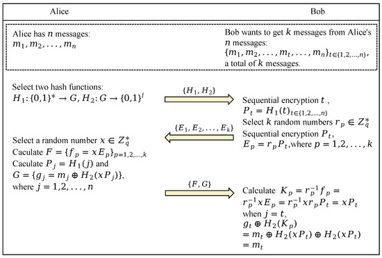 Oblivious transfer (OT) is a basic cryptographic primitive that is widely used in areas such as secure multi-party computation. OT was first proposed by Michael O. Rabin [33] in 1981. In Rabin’s OT protocol, the sender, Alice, sends a message (m) to the receiver, Bob, and the receiver (Bob) accepts the message (m) with a probability. Therefore, at the end of the communication, Alice has no way of knowing which message Bob has accepted. Subsequently, after continuous improvement by researchers, it can be generalized to the k-out-of-n OT scheme. In general, there are two entities in an , namely a sender containing n messages and a receiver who wants to receive k messages from the sender’s n messages. The receiver can select k messages from the n messages, denoted as . In other words, the receiver can only receive the k messages it has selected, and the sender has no way of knowing which specific messages the receiver has received [34]. is defined as follows: Alice holds n messages, and Bob wants k of them. Bob encrypts the desired k messages and sends them to Alice, who encrypts all of them and returns them to Bob. In the end, Bob can only receive the messages he wants. In particular, Alice does not know the details of the information obtained by Bob, while Bob cannot be informed of the other information Alice has. The specific process is shown in Figure 1 below.