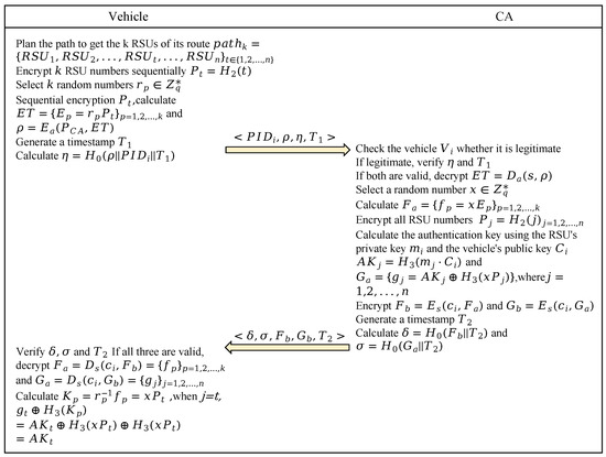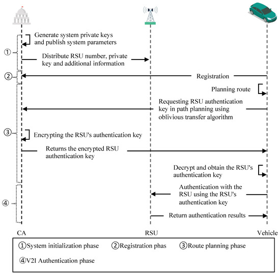- In the route-planning phase, the RSU authentication key sent by the CA to the vehicle is based on the RSU private key with the vehicle’s public identity key added. In this way, the confidentiality of the RSU private key is guaranteed, in addition to ensuring that this authentication key can only be used by the vehicle that applies for it.