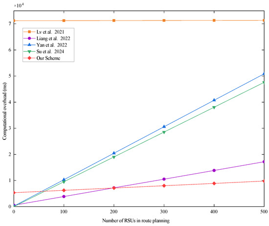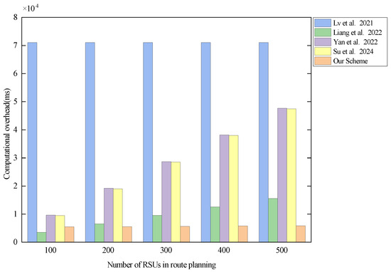 Since the computation time of the route-planning phase is mainly related to the number of RSUs, the number of RSUs in the system needs to be determined by the coverage of the system. We determined the range of our scheme based on the communication coverage method proposed by Gang et al. [35]. Take the city of Houston in the U.S. as an example. The area of Houston is about 1659.4 square kilometers [36]. The maximum communication distance of an RSU is 1 km, and the communication coverage area of an RSU is about 3.14 square kilometers. Approximately 500 RSUs are required to cover the entire city of Houston. Therefore, we take 500 RSUs in the system as an example to analyze the computational overhead corresponding to different protocols. The results of the analysis are shown in Figure 5 below.