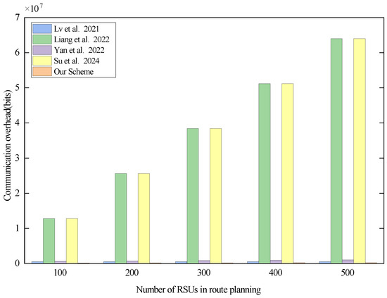 Communication overhead of each scheme in the route-planning phase when there are 500 RSUs in the system. Lv et al. proposed the scheme in [29], Liang et al. proposed the scheme in [30], Yan et al. proposed the scheme in [31], and Su et al. proposed the scheme in [32].