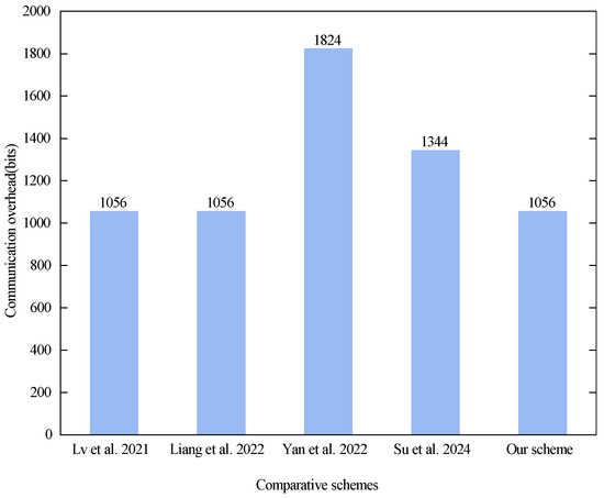 In the V2I authentication phase, the messages to be communicated by the scheme proposed in [29] are , H(E), , and , and the expended communication overhead is bits. The messages to be communicated in scheme [30] are and , and the spent communication overhead is bits. The messages to be communicated in the scheme proposed in [31] are and , and the expended communication overhead is bits. The messages that need to be communicated in scheme [32] are , , and , and the spent communication overhead is bits. The messages to be communicated in our scheme are and , and the spent communication overhead is bits. Finally Figure 8 shows a comparison of the communication overhead of the V2I authentication phase between the different schemes.