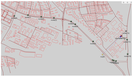 Figure 9 shows the simulation process of our scheme. From Figure 9, we can visualize the interaction process between the vehicle and RSU for authentication in the V2I authentication phase. The nodes in the figure represent traveling vehicles, and rsu[0] represents the RSU. In addition, green nodes represent vehicle that have completed mutual authentication with the RSU, the white node represents a vehicle that has not yet completed mutual authentication with the RSU, and the red node represents that a vehicle in the process of mutual authentication with the RSU. The blue dotted line indicates that the vehicle and RSU are interacting with each other.