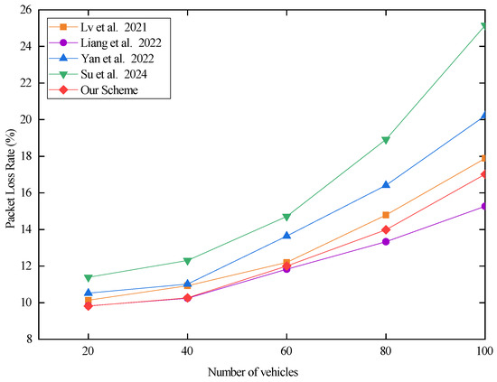 The packet loss rate for different traffic volumes in the V2I authentication phase. Lv et al. proposed the scheme in [29], Liang et al. proposed the scheme in [30], Yan et al. proposed the scheme in [31], and Su et al. proposed the scheme in [32].