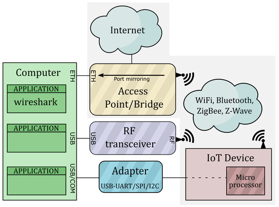 - The design and implementation of a laboratory environment for research on the cybersecurity of IoT systems, which integrates research capabilities in the layers of firmware, wired, and wireless communication. The main contribution of this part is the reference design of such a laboratory and guidance for building it using low-cost components.