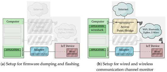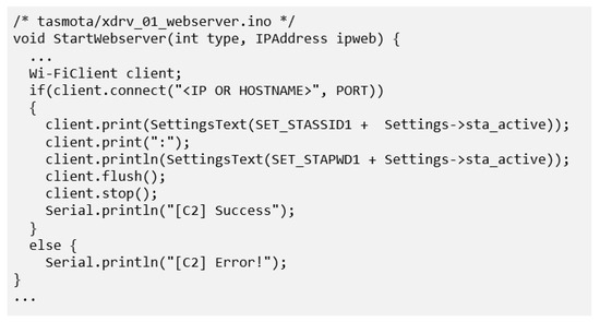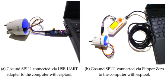 End platforms differ from each other only by the end-user software. One of the most popular and cheapest platforms used in Smart Home devices is the ESP8266EX microcontroller. This is a simple system-on-a-chip (SoC) device equipped with an integrated Wi-Fi module [54]. Its successor is the ESP32 platform, which additionally offers a Bluetooth module. However, it is more expensive, which determines a smaller market share as a component in cheap IoT devices. One of the basic features of many of the available IoT devices is the ability for users to modify them. This aspect can be treated both as a great advantage and a potential source of problems. It is expected that the user will receive a certain degree of freedom in configuring or even modifying IoT devices to their requirements. However, with a low awareness of cybersecurity risks, this opens up a space that cyber attackers can use to implement various attack scenarios. The manufacturer of the described microcontroller, Espressif, has enabled basic programming using an open UART interface. This approach allows for a trivial extraction of the device’s source code, and the only security measures exist at the level of the embedded software, i.e., firmware. This approach does not guarantee security in terms of the integrity of the physical and logical interface of the device. One of the possible threat scenarios could include a straightforward placement of malicious executable code. As a result, an attacker could gain access to the Wi-Fi password of a router. The ability to extract embedded software is not limited to devices produced by Espressif. Many other IoT device manufacturers also use open interfaces such as UART, JTAG, and SPI, making firmware extraction relatively easy. Additionally, techniques such as bus sniffing, firmware dumping, and reverse engineering can also be utilized to extract embedded software. However, it is important to note that these techniques may require specialized equipment and knowledge.