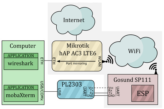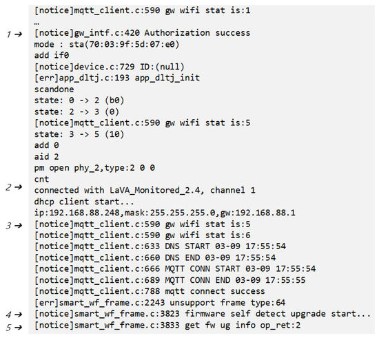 The experiments described in Section 5.2.1 revealed that there are messages with sensitive data in wired and wireless communication channels. It is noteworthy that all logs were displayed within a short time frame (several seconds). Upon connecting to the internet, the device was able to download code from the manufacturer’s website, without even allowing an opportunity for confirmation. Given the device has full access to the private network, attention should be paid to the threat posed by unscrupulous cloud solution providers. In [65], the possibility of exploiting this update channel to import malicious software into all connected devices to create a malicious botnet was raised. From a monitoring and data analysis perspective for cybersecurity, such a 1 MB firmware in reference to the scale of traffic processed by network devices is negligibly small and transmitted in encrypted traffic. This means that reliance cannot be placed on a network threat detection solution, making research such as that presented in this article and its conclusions for cybersecurity particularly important. It is also worth mentioning that the UART interface, being a debugging channel for the device, is not locked for use in production. Although passwords do not appear in messages, they can be correlated with wireless communication to provide an additional, unencrypted reference source.