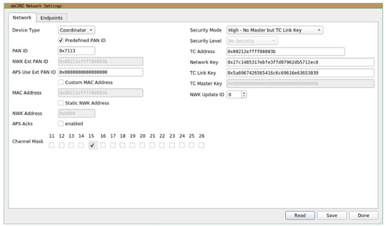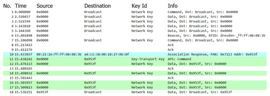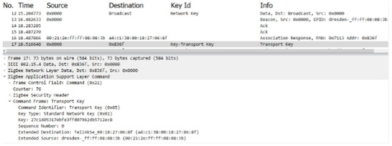 One of the most important aspects of network communication security in the IoT is securing wireless interfaces. Frequently used wireless protocols include ZigBee [21], Bluetooth [23], and Z-Wave [22]. Vendors prefer the ZigBee standard due to a better energy-efficiency than the other standards, so the device’s battery will last much longer. Moreover, ZigBee networks are easy to install and self healing. The topology may be dynamically changed in the case of the malfunction of one of the devices. Due to the aforementioned benefits, ZigBee is commonly used, and more wireless communication analysis has focused on ZigBee. ZigBee supports two security models [50]: centralized and distributed. The first model can contain three types of devices: router, coordinator, and end device. The router can forward ZigBee packets between end devices within a given network or between networks when it is connected to successive routers. The coordinator only works within one network, stores security keys, and enables authentication of end devices when connecting them to the network. End devices can be added to the ZigBee network, but they cannot create networks and forward packets by themselves. The distributed model does not include a coordinator, and encryption keys are passed through interconnected routers. This solution is less secure, because the encryption keys are not stored by a single device.