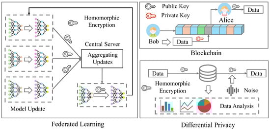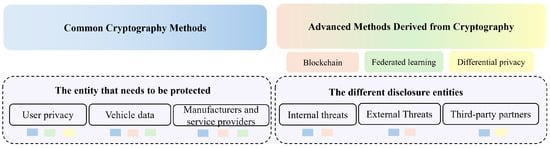 Federated learning, a technique grounded in cryptographic protocols, stands as a highly effective privacy-preserving methodology within the realm of connected vehicles. By utilizing cryptographic measures such as secure multi-party computing, federated learning facilitates collaborative model training among vehicles or devices without the need to disclose local data, thereby upholding stringent privacy safeguards. These cryptographic protocols include advanced techniques such as secret sharing and functional encryption, enhancing the security and privacy of the distributed learning process. Moreover, within the domain of vehicular networks, federated learning is often strategically deployed in conjunction with cutting-edge technologies, including blockchain and differential privacy techniques, to fortify the comprehensive privacy-protection framework. Ref. [] introduces a pragmatic privacy-preserving collaborative deep learning system that facilitates the cooperative construction of a collective deep learning model using data contributed by all participants, all while circumventing the need for direct data sharing and central data storage. To further mitigate potential privacy breaches stemming from the sharing of model parameters, this research leverages functional mechanisms to perturb the objective function of the neural network during the training process, thereby achieving -differential privacy.