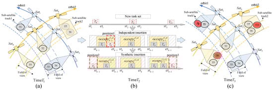 MSDMP fundamental scenario is shown in Figure 1. Assuming that a set of satellites need to execute a set of target tasks within a given task planning time , the visible time window of the target tasks is , and the satellite executable orbit is , the system generates an initial task planning scheme at the moment of as shown in Figure 1a, and the task planning scheme on the is , and that on the is .