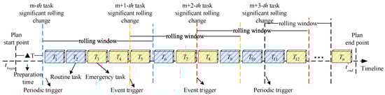Figure 2 introduces the execution process of the task scrolling window. During the task planning time , a group of target tasks is dynamically updated with the target task importance, where the event trigger threshold is set to ; the blue and yellow squares represent the regular and emergency tasks, respectively, and the dotted lines of different color are used to split the different task scrolling windows, which overlap. The initial moment is followed by the preparation time , which is triggered by the periodicity to initiate the mth task roll; the th task roll is triggered by the contingency tasks at time , the th task roll is triggered by the contingency tasks at time ; and the th task roll is initiated by a periodic trigger at the moment ,which loops until the end of the task planning time.