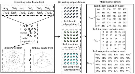 Thirdly, the fitness values of the task benefit objective function, the task timeliness objective function, and the task completion objective function are used as the evaluation criteria, and the individuals on the optimal Pareto frontier are sorted in descending order of the fitness values of the three sub-objective functions to generate the task benefit sub-population , the task timeliness sub-population , and the task completion sub-population .