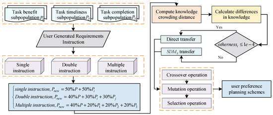 Secondly, the knowledge transfer strategy for the multi-objective evolutionary algorithm (HPIM–KTSMOEA) is used to perform evolutionary operations on the new generation population by calculating the crowding distance between the knowledge as well as the otherness of the knowledge. According to the otherness of the knowledge as a medium of knowledge transfer between the historical environment and the current environment, the algorithm adaptively selects the knowledge transfer strategy for solving and outputting the MSDMPUP user preference planning scheme when reaching the termination condition.
