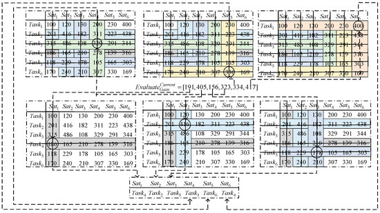Taking the reflective output of the task benefit priority command sent to the satellite controller as an example, the principle of the interactive output layer is introduced, as shown in Figure 5. The target assessment matrix of task benefits obtained by the evolutionary operation of the new generation population is , and the historical task benefit assessment matrix is used as a reflective reference. The current sub-objective assessment value of 191 is matched one by one with the assessment value in the first column of the historical task benefit assessment matrix , and the historical sub-objective assessment value of 186, which has the smallest difference with the current sub-objective assessment value is matched, and its reflective projections are retrieved to obtain the satellite and target task sequence relationship as . The rows in which the historical sub-objective assessment value of 186 is located in are invalid values; these values are removed from the assessment matrix and matched against the next sub-objective assessment value of 405. The loop traversal method is used to output the final allocation sequence: , , , , , .