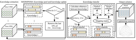 Therefore, this section proposes a knowledge transfer strategy for the multi-objective evolutionary algorithm (KTSMOEA), which is capable of considering both regular and stochastic changes, efficiently tracking environmental changes, and accelerating the convergence of populations in new environments. The schematic diagram of the algorithm is shown in Figure 6.