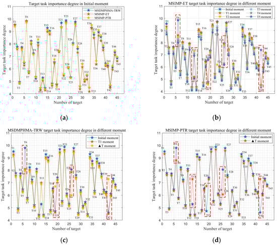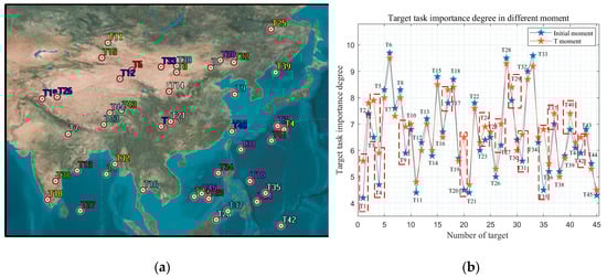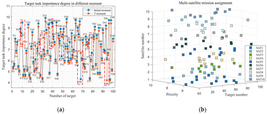 It is assumed that the observed target tasks for demand changes globally include (T10, T23, T31, T39, T49, T57, T68, T79, and T94) at the moment of T. The initial moment and the importance of the target tasks at the moment of T generated by using the MSDMPUP–TRW model are shown in Figure 11a. To more directly demonstrate the allocation relationship between the satellite and the target mission in the case of the no-satellite controller preference command sending, the HPIM–KTSMOEA algorithm is used to solve the visualization of the initial multi-satellite dynamic mission planning scheme in this scenario. As shown in Figure 11b, the x-axis denotes the target mission number, the y-axis denotes the target mission corresponding to the target mission importance, and the z-axis denotes the executing satellite number. To show more clearly the target missions performed by different satellites, different colored squares are used to represent the target missions performed by different satellites.