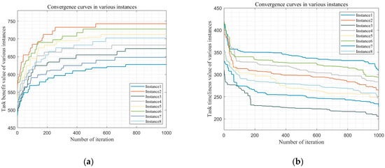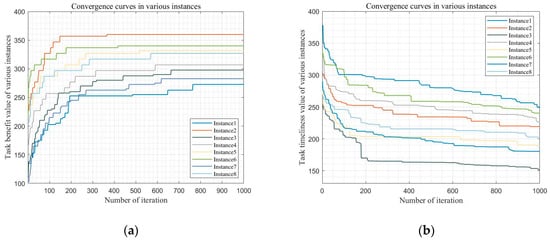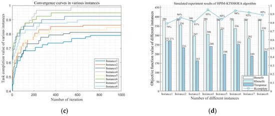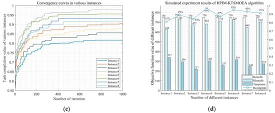 The performance analysis of the HPIM–KTSMOEA algorithm for solving different instances is shown in Figure 9. Figure 9a–c represent the convergence curves of the HPIM–KTSMOEA algorithm under the three dimensions of the task benefit objective function, task timeliness objective function, and task completion objective function, respectively, and Figure 9d represents the average values of the HPIM–KTSMOEA algorithm under the different evaluation indexes.