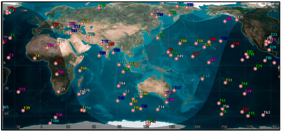 To verify the effectiveness of the HPIM–KTSMOEA algorithm for solving MSDMPUP on a large scale, Experiment 3 randomly generates 100 target tasks for simulating user imaging task requirements on a global scale in longitude [−90, 90] and latitude [−180, 180], and the geographical distribution of the 100 target tasks on a global scale is shown in Figure 10.