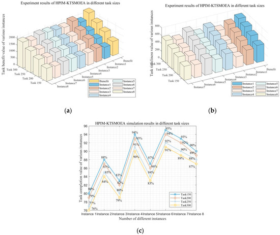 The performance analysis of the HPIM–KTSMOEA algorithm for solving MSDMPUP at four scales of 150, 200, 250, and 300 target tasks is shown in Figure 13. Figure 13a demonstrates the target task benefits that the HPIM–KTSMOEA algorithm can obtain under different target task sizes, reflecting that the algorithm has a good ability to optimize resource allocation and task scheduling. Figure 13b demonstrates the time response of the HPIM–KTSMOEA algorithm under different target task sizes, and the algorithm is always able to complete the target task allocation with a low response time. Figure 13c demonstrates that the instances of the HPIM–KTSMOEA algorithm under different target task sizes all have high task completion.