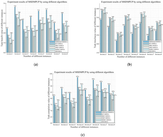 The performance analysis of the HPIM–KTSMOEA algorithm for solving different instances of MSDMPUP at a large scale is shown in Table 6 and Figure 13. The solving instances include no preference instruction input, single instruction input, dual instruction input, and multiple instruction input, with a total of four types and eight sets of instances, as shown in the column of instruction input in Table 6. Meanwhile, the evaluation indexes in Table 6 include target task ideal benefit , actual task benefit , task response time , and task completion rate .