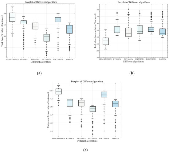 We further analyzed the HPIM–KTSMOEA algorithm, KT–MOEA algorithm, BKT–MOEA algorithm, HKT–MOEA algorithm, BOKT–MOEA algorithm, and HO–MEA algorithm data using box plots in Instance8. Figure 15a–c represent the box plots of different algorithms under the three dimensions of the task benefit objective function, the task timeliness objective function, and the task completion objective function, respectively. The top and bottom of the box plots represent the upper quartile and lower quartile, respectively, the top and bottom edge lines represent the maximum and minimum values, the middle line segment represents the average, and the black plus sign represents the outliers.