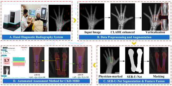 This study aims to address the limitations of the traditional U-Net in automatic bone segmentation. We proposed an end-to-end CKD-MBD classification framework named SER-U-Net, which incorporates lossless image compression and a squeeze-and-excitation deep residual network (SE-ResNet). This framework embeds the squeeze-and-excitation network (SENet) as a substructure within the residual network. Finally, image segmentation is accomplished based on U-Net. Here, we refer to this model as SER-U-Net. In summary, the aim of this study is to utilize X-ray images of the hand’s metacarpal bones obtained through commercially available low-dose hand X-ray testing instruments. Subsequently, through the established SER-U-Net model, the metacarpal bone region will be automatically selected and cortical bone thickness calculated, as shown in Figure 1. Finally, the correlation between this value and DXA bone density assessment results will be tested. We define our subjects as long-term kidney dialysis patients, as they are at higher risk for renal osteodystrophy or osteoporosis. Suspected osteoporosis patients can undergo full-body bone density scans promptly via DXA instruments and initiate appropriate treatment when necessary.