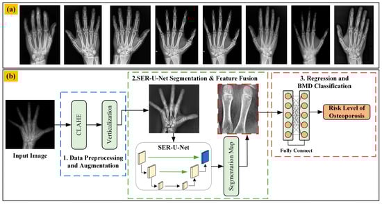 (a) Examples of hand X-ray dataset as final test set. (b) The overall process framework includes: (1) data preprocessing, (2) SER-U-Net segmentation and feature fusion, and (3) Regression and BMD classification.