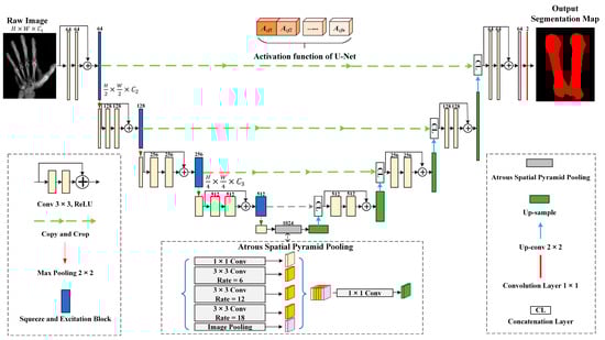 Over the past few decades, researchers have developed numerous sophisticated automatic medical image segmentation methods. Indeed, the smart utilization of CNN feature engineering has swiftly progressed in areas like object detection, image segmentation, and classification [20,21,22,23,24]. With the advancement of medical image segmentation, many deep-learning-based network models have been proposed, and it has been demonstrated that deeper networks are better suited for image segmentation tasks [25,26,27]. In [28], a Lightweight U-Net Architecture Multi-Scale Convolutional Network was presented. Experimental results demonstrated strong performance in segmenting hand bones, particularly for the smaller bones in the hand. However, during the training of deep models, issues such as gradient explosion or vanishing can make training deep models challenging. Currently, optimized activation functions like ReLU (Rectified Linear Unit) are used to address such problems [29]. Based on the above, while the aforementioned methods proved effective for many X-ray image segmentation tasks, their direct application to clinical data reveals insufficient accuracy and robustness. This limitation markedly impedes the broader application of deep-learning methods in clinical bone density analysis.