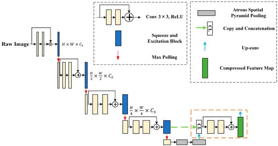 In Figure 5, the process entails adjusting image dimensions through convolution and pooling, achieving initial feature selection via up-sampling and shallow feature fusion. After passing through two convolutional layers with a kernel, the input data transitions from , where represents the number of channels. Subsequently, it undergoes max-pooling to compress its size to . When it reaches a specific size, feature fusion and extraction take place. In this study, the final size of the feature map is . The purpose of this module is to retain critical features while eliminating redundant spatial information to reduce the original image size, thereby shortening training time and ensuring the preservation of essential features.