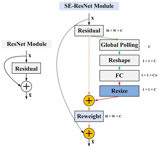 CNNs have demonstrated superiority in computer vision tasks, and through the use of the SENet, they can connect and learn interchannel features, thereby enhancing feature information and recalibrating strategies to improve the performance of CNN models [34]. In the SE model, input information is compressed using the squeeze operator, which employs global average pooling to create statistical channels. Activation processing involves two fully connected layers, incorporating nonlinearity and ReLU. During this phase, the activation operator assigns weights to the input data, generating weight channels, while the size of feature channels remains consistent through the squeeze and activation operators. Residual blocks in ResNet effectively utilize shallow features to extract more critical features and have been frequently employed as the primary structure for feature extraction in image classification and recognition tasks [35]. Therefore, in this study, we decided to integrate the SE block into the ResNet model, resulting in the SE-ResNet module, as illustrated in Figure 6. In this module, the SE operation takes place before the summation operation [36].