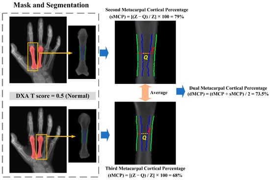 After conducting bone region segmentation using a U-Net-based approach, the metacarpal cortical percentage computation process focuses on the central one-third of the metacarpals (Figure 9). Subsequently, the dMCP values, which are the average cortical percentage derived from the 2MC and 3MC regions, were calculated. Here, we utilized a weighted ratio distribution method. When the feature model detects a higher risk for osteoporosis features (MCP < 50) with 2MC or 3MC, the weight proportion for that metacarpal bone will be increased. To establish our test dataset, we obtained 120 hand X-ray images from 30 hemodialysis patients within a four-week period, with the approval of the clinical IRB. Among these, there were 8 cases of individuals with normal bone mineral density, 15 cases of low bone mass, and 7 cases of osteoporosis (including 1 severe osteoporosis by WHO criteria). From the 120 hand X-ray images, a radiologist manually selected the best-quality image for each patient’s arm. In the subsequent steps of the dMCP calculation process, the narrowest transverse diameter of the metacarpal bone shaft is identified as “Z”. A second parallel measurement is then performed for the intramedullary components at the same location, here referred to as “Q”. We employ the formula [(Z − Q)/Z] × 100 to derive the cortical percentage for both 2MC and 3MC, designated as sMCP and tMCP, respectively. Finally, the results are averaged to obtain the outcome of dMCP.