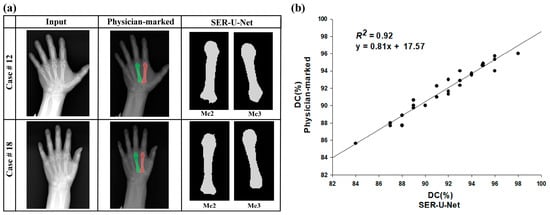 (a) Two groups of clinical hand X-ray image segmentation cases. (b) Correlation between physician manual and automatic model segmentation (R2 = 0.92).