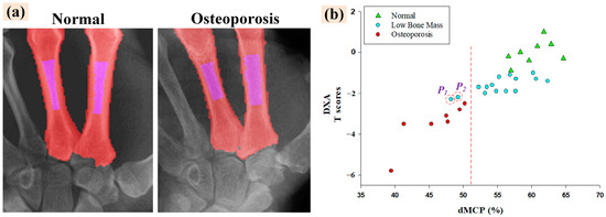 Demonstration of analysis used to calculate dMCP. (a) Results for subjects with normal bone density and osteoporosis. Among them, the red area represents the segmented 2MC and 3MC regions, while the blue area indicates the intramedullary components and the narrowest transverse diameter. (b) Scatter plot showing X-ray images of 30 subjects using dMCP classification results and correlation between DXA T-scores.