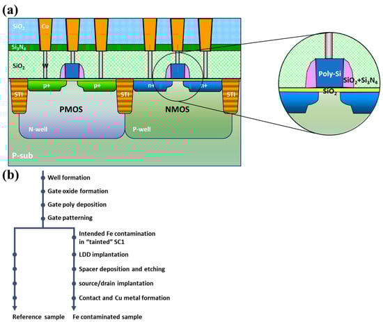 To clarify the effects of Fe impurity on ultrathin gate oxide, we selected planar MOSFETs with a gate oxide layer thickness of 34 Å as the test platform, which was measured using spectroscope ellipsometry. Figure 1a shows the schematic cross-section of the device structures with a local magnified image near the gate oxide. In this experiment, the MOSFETs with intentional Fe contamination from the polysilicon gate were prepared using the standard CMOS technology. The flow of the sample preparation process is shown in Figure 1b. Gate oxide with a thickness of 34 Å was grown in a furnace at 870 °C in a dry oxygen environment. Subsequently, the polysilicon gate was deposited by low-pressure chemical vapor deposition. The gate with a thickness of 1800 Å was then patterned by dry etching. Afterward, a specific wafer was intentionally contaminated with Fe by immersion in a “tainted” [7] SC1 (H2O2/NH4OH/H2O = 2:1:50 in volume) solution for 20 min and then spun dry at 25 °C. The “tainted” solution was prepared by dissolving predetermined amounts of FeCl3 to a level of 0.01 ppm in weight. The polysilicon gate was then doped along with lightly doped drain (LDD) and source/drain implantation; the dopant elements were boron and phosphorus for the PMOS and NMOS, respectively. Rapid thermal annealing (RTA) at 1025 °C for 30 s was then used to activate the implants to achieve a homogeneous distribution. After the formation of CoSi2 salicide and tungsten contact via, a standard Cu dual-damascene process was adopted to define metallic interconnections. The reference wafer underwent the same process conditions as the contaminated one except for Fe contamination. The thicknesses of the gate oxide and polysilicon gate were characterized by spectroscope ellipsometry, a fast, contactless, and nondestructive technique that is widely used for the in-line monitoring of film thickness in the microelectronics industry. The MOS capacitor test structures (oxide area = 100 × 60 μm2) for the below investigations are located at the scribe line. The distance between the NMOS and PMOS test structures was only about 380 μm.