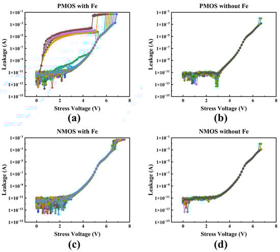 Current vs. voltage (IG-VG) curves of (a) contaminated PMOS, (b) uncontaminated PMOS, (c) contaminated NMOS, and (d) uncontaminated NMOS by the V-Ramp test. The different colors represent different test samples.