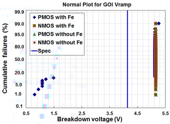 The Vbd specification (4.14 V) was set to be 2.3 times the operation voltage (1.8 V) for both the NMOS and PMOS. This is a crucial parameter for CMOS gate oxide reliability, as chips constructed from gate oxide with a breakdown voltage lower than this value may exhibit early product failure or extrinsic reliability failure during the product’s lifetime. The Vbd distribution data show that the uncontaminated PMOS and NMOS from the reference wafer presented a clean distribution with a Vbd of 5.16 V. It is clear that the contaminated NMOS exhibited a comparable performance (Vbd = 5.15 V) with that of the uncontaminated one. In contrast, although the majority of the contaminated PMOS show a Vbd of 5.13 V, the obvious early failure (failure ratio: 8/71) with a Vbd lower than 1.5 V is likely the deleterious effect of Fe contamination. Therefore, the V-Ramp data show that the PMOS was much more sensitive to Fe contamination than the NMOS.