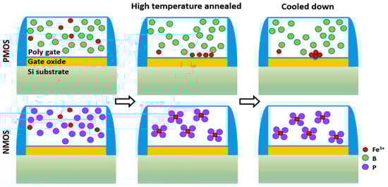 The different behaviors of Fe impurity in PMOS and NMOS are illustrated in Figure 6. In the boron-doped polysilicon gate of PMOS, Fe can form unstable FeB pairs (formation energy = 0.65 eV) with B acceptors by electrostatic attraction. FeB pairs can be easily dissociated by annealing at a temperature above 200 °C, or by shining bright white light on the wafer [16,17]. Meanwhile, for NMOS, Fe in phosphorus-doped Si can be stably bound in the form of P4-Fe clusters with a formation energy of 3.2 eV [18], which is difficult to separate even at a high temperature. Therefore, phosphorus-doped layers are a common method to getter Fe efficiently into polysilicon solar cells [19,20]. It is well known that the Si/SiO2 interface acts as a sink for Fe impurity [1,21,22]. Therefore, a larger amount of Fe in PMOS than in NMOS could diffuse and segregate to the gate/oxide interface during the high-temperature process stages. Fe impurity around the interface in PMOS would be oversaturated [2,16] when cooled down, and it would react with Si and form thermally stable β-FeSi2 with the help of oxygen precipitates [1,23,24]. If β-FeSi2 precipitate grows to a certain extent, it reduces the oxide thickness and enhances the local electric field, which results in a poor GOI performance of PMOS [7].