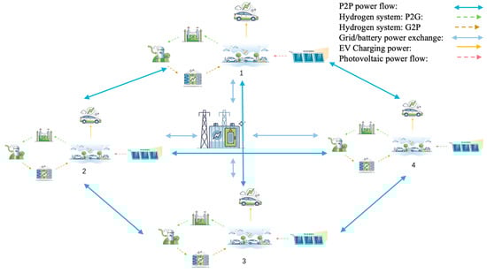 P2P energy trading is a revolutionary approach in the energy sector that allows individuals or businesses to buy and sell electricity directly with each other, typically without the involvement of traditional energy suppliers. This model leverages technology like blockchain and smart grids to facilitate these transactions. P2P energy trading can lead to more efficient use of renewable energy, lower energy costs, and reduced dependence on large-scale utility companies. It empowers consumers to become ‘prosumers’—energy producers and consumers—and can contribute to a more sustainable energy system. Zhou’s study [] explores P2P energy sharing in smart communities, focusing on its role in advancing renewable energy adoption. It reviews P2P systems, addresses challenges, and examines artificial intelligence- and blockchain-based strategies for efficient energy trading, highlighting the potential economic and operational benefits []. The study emphasizes the need for further research to enhance P2P system effectiveness in renewable energy markets, particularly focusing on the dynamics of P2P energy trading in community microgrids. The research develops a game-theory-based decentralized trading scheme that focuses on the impact of distributed energy resource (DER) ownership []. P2P trading benefits participants economically but can lead to losses in communities with high photovoltaic penetration. It underscores the need for strategic DER management to optimize economic outcomes in P2P energy trading []. In [], the authors employ fuzzy optimization techniques to balance economic and environmental objectives in energy trading and propose a multi-period P2P trading model that simultaneously minimizes electricity costs and carbon emissions. Another paper uses a distributionally robust optimization approach, utilizing a fuzzy set based on Wasserstein distance for renewable energy prediction error, and proposes a day-ahead microgrid P2P transactive energy trading model, employing a linear and convex programming approach to address the nonlinear aspects of the model []. A novel model for optimizing P2P energy trading in multi-microgrid systems uses Nash bargaining theory and data-driven chance constraints to manage uncertainties in renewable energy and load forecasting []. In [], the authors provide a comprehensive analysis of 50 global peer-to-peer distributed renewable energy trading projects.