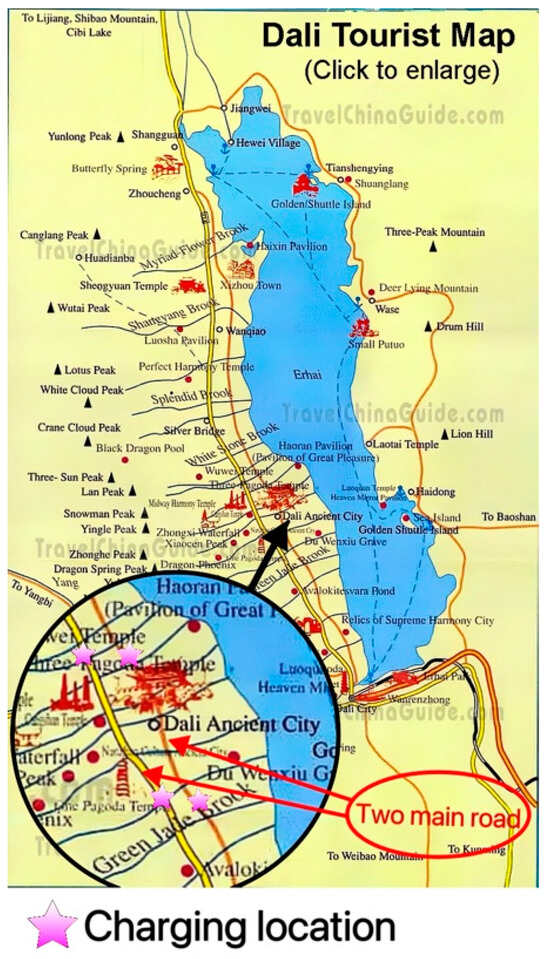 Dali, located in Yunnan Province, China, was chosen as the case study primarily due to its geographic features and the prosperity of its tourism sector. Surrounded by mountains and lakes, Figure 3 shows that Dali’s transportation is heavily dependent on two main north–south highways, and the constant tourism demand throughout the year further exacerbates transportation needs. Therefore, constructing charging stations has become a key measure to optimize the transportation infrastructure and support sustainable development. This not only helps alleviate traffic pressure but also encourages the use of eco-friendly transportation methods, such as electric vehicles, thereby enhancing Dali’s tourism experience and environmental protection levels. There are numerous charging points in the parking area, but most require both parking and charging fees, which can be inconvenient for users. SHS-EVCSs offer a more cost-effective solution for electric vehicle owners. Additionally, SHS-EVCSs prioritize providing a safer and more secure charging environment, ensuring peace of mind for all EV drivers.