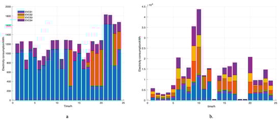 Game theory, a mathematical framework for analyzing strategic interactions among rational decision-makers, can be applied effectively in renewable energy trading. This application is particularly relevant in markets like P2P energy trading, where multiple participants (consumers, prosumers, utility companies) interact [,,]. Game theory provides a framework for understanding the strategic interactions between independent charging stations, each acting as rational players seeking to optimize their outcomes by modeling the decision-making processes of these entities, which can predict their behavior in response to varying energy supply, demand, and pricing conditions. In P2P energy trading, game theory can optimize energy distribution among participants. This involves strategies for energy distribution that are efficient, cost-effective, and fair, considering the varying production capacities and needs of different participants. In [], the authors aimed to achieve higher economic income and maintain multi-agent income equilibrium. By employing the finite improvement property and a variable-step iterative convergence method, the study ensures efficient and accurate convergence of the model []. The model’s simulation application demonstrates improved energy utilization rates and increased economic profits. The article [] proposes a novel transactive energy market model using blockchain technology and game theory. The study introduces a proof-of-reserve consensus mechanism for prosumer–consumer transactions, enhancing energy trading efficiency and privacy, and uses game-theoretic market rules to establish a sustainable energy generation and consumption balance while ensuring economic agent privacy []. Another study [] introduces a game-theory-based demand response program (DRP), integrating both incentive- and price-based DRP concepts, targeting residential, commercial, and industrial sectors; it evaluates three pricing strategies: fixed pricing, time-of-use pricing, and real-time pricing, along with their combinations. This approach leads to increased utility profits, reduced customer costs, and a more balanced load curve.