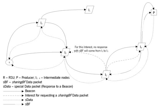 In fact, the described process has five objectives: (1) query the content sources and their content; (2) allow the intermediate nodes to know the content sources; (3) allow the intermediate nodes to know the RSU; (4) allow the nodes to update their list of neighbor nodes; and (5) use the sharingBF Data packet to distribute the list of cached content among intermediate nodes.