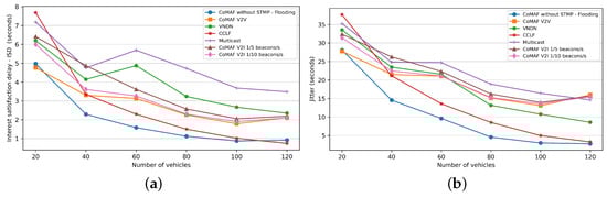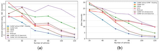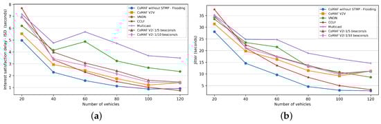 - Kuai, M.; Hong, X.; Yu, Q. Density-Aware Delay-Tolerant Interest Forwarding in Vehicular Named Data Networking. In Proceedings of the 2016 IEEE 84th Vehicular Technology Conference (VTC-Fall), Montreal, QC, Canada, 8–21 September 2016; pp. 1–5. [Google Scholar] [CrossRef]
