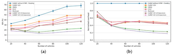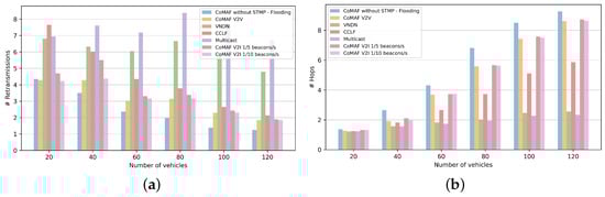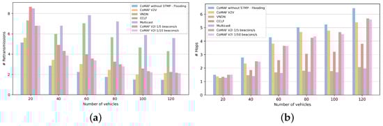 State-of-the-art protocols in this category [,,,,,] resort to beacon broadcasting for discovering new neighbors and updating the positions of the already existing ones. Broadcasting an additional control packet into the network results in an increased transmission overhead. The frequency of the beacon broadcast should be chosen wisely, taking into consideration that, although broadcasting with high frequency is better for updating the list of neighbors, it also results in increased traffic, which may result in a broadcast storm, and consequently deteriorated performance. This problem is exacerbated in dense network scenarios. Conversely, sending less frequent beacons is better for keeping the traffic low and the channel reserved for the actual content dissemination. This, however, results in an outdated list of neighbors, which in turn affects negatively the efficiency of the protocol. Therefore, a compromise between these two factors (i.e., transmission overhead and the timely updated list of neighbors) should drive the selection of the frequency for beacon broadcasting. Instead of using beaconing for neighbor discovery, the proposal in [] uses a pair of digital cameras for collecting the visual identification of vehicles in the range (line of sight) of the cameras. The need for a line of sight, and the complexity of processing the visual data (i.e., license plate, color, brand, and car type) and accurately distinguishing the neighbors may be challenging, mainly in a dense network. Another alternative to beacon broadcasting is the overhearing of the packets in the wireless channel and using them to build and update the list of neighbors. Moreover, as proposed in [], incorporating packet overhearing and mobility prediction for updating the list of neighbors may avoid the need for beacon broadcasting and help to keep the transmission overhead low.