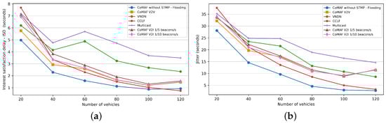 Intelligent Transportation Systems (ITS) [,], including other intelligent urban technologies, are the near future realities. Vehicular Ad hoc Networks (VANETs), or, more broadly, Vehicular Named Data Networking (V-NDN), have been seen as a potential network for the realization of the aforementioned technologies. The current development of these technologies, in terms of network communication, is based on the TCP/IP protocol stack, which was designed as a host-centered architecture. Current network applications are content-centric, and impose high demands in terms of network speed and bandwidth. Deploying these applications in a highly mobile network characterized by ephemeral and highly intermittent links between communicating nodes exacerbates the problems presented by a host-centric architecture. Aiming at solving the aforementioned problems, several Information-Centric Networking (ICN) based network architectures are currently under development. Named Data Networking (NDN), a specific realization of ICN, has been seen as a potential architecture to overcome some of the issues presented by the IP protocol stack (i.e., related to supporting mobility, routing and forwarding, network security, in-network caching, and application deployment).