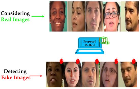 There are limited datasets available for deepfake detection. The Deepfake Detection Challenge (DFDC) dataset [49], one of the largest of these, can be used. It is a training dataset published for use in the DFDC Kaggle competition. Facebook created this dataset of more than 100,000 videos. The videos are shot by real people and contain a mix of real and fake videos. Various algorithms were used to create the deepfake videos. The size of this dataset is 471 GB, of which 4.5 GB were used in this paper. Some of the images are shown in Figure 2.