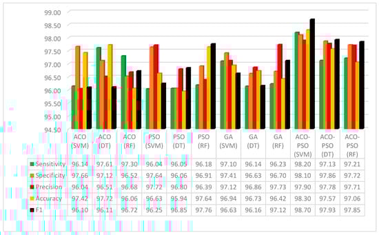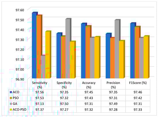 First, the colorectal dataset was selected, the suggested strategy was implemented, and the images were used to evaluate the approach’s efficacy. Table 2 shows the results regarding the sensitivity, specificity, and accuracy index comparisons between the proposed method, such as ACO, PSO, GA, and optical flow algorithms based on ACO-PSO approaches. For two classes, the suggested method’s mean sensitivity, specificity, and accuracy values were compared with those of competing methods. Table 3 shows the relationship between the sensitivity, specificity, accuracy, and F1 scores.